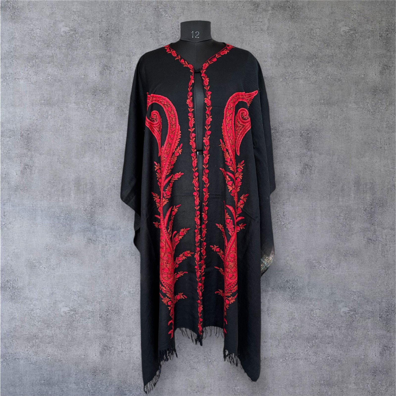 Cape Shawl – Pure Wool – Handwork|Handmade – Black with red embroidery